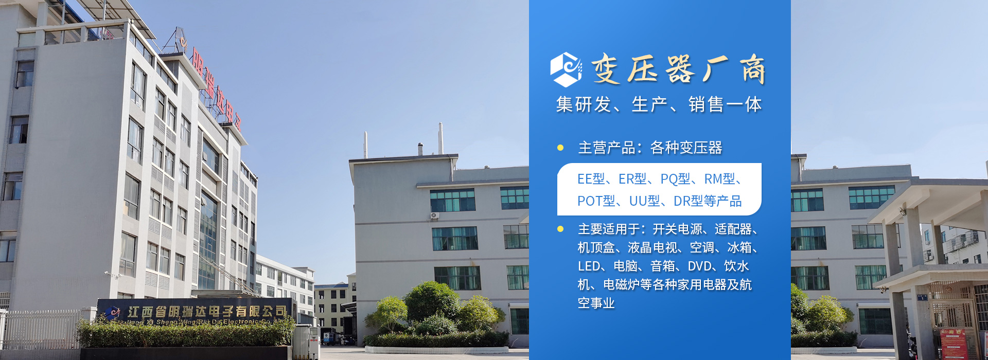 江西省明瑞達電子有限公司座落于江西省贛州市石城縣,是一家研發、生產、銷售各種變壓器廠商。生產銷售、技術服務、產品研發為一體的綜合性企業,主要生產、銷售產品:變壓器(EE型、ER型、PQ型、RM型、POT型、UU型、DR型等產品),主要適用于:開關電源、適配器、機頂盒、液晶電視、空調、冰箱、LED、電腦、音箱、DVD、飲水機、電磁爐等各種家用電器及航空、醫療事業。